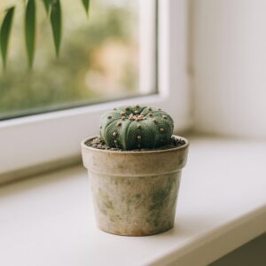 Es gibt kaum einen pflegeleichteren Kaktus ohne Stacheln als diesen. Er wächst sehr langsam und behält seine skulpturale Form über Jahre, ohne wild zu wuchern. Das macht ihn perfekt für schmale Fensterbänke oder moderne Arrangements in Betontöpfen. Aber lass dich von seiner „steinernen“ Optik nicht täuschen: Im Sommer kann oben aus der Mitte („Scheitel“) eine wunderschöne, seidig-gelbe Blüte sprießen, die oft größer ist als der Kaktus selbst. Einziger Wermutstropfen für Gieß-Fanatiker: Die Bischofsmütze hasst nasse Füße noch mehr als andere Kakteen. Da sie keine Dornen hat, die Wasser verdunsten, braucht sie extrem wenig Flüssigkeit. Also lieber einmal zu wenig gießen als einmal zu viel, dann bleibt dein „Kuschel-Stein“ ewig schön.