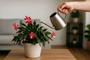 Aber auch hier gibt es wieder den feinen Unterschied zwischen Wüste und Wald. Dein Wüsten-Exemplar (wie das Astrophytum) braucht im Winter eine strikte Ruhepause. Von Oktober bis März stellst du das Gießen fast komplett ein – ein Schluck pro Monat reicht oft völlig, wenn er kühl steht. Dein Kaktus ohne Stacheln aus dem Regenwald (Weihnachtskaktus & Co.) tickt da anders. Er darf nie komplett austrocknen wie ein Wüstenkaktus, sondern sollte immer leicht feucht (nicht nass!) gehalten werden, besonders wenn er gerade Knospen ansetzt. Wenn du diese Pflanzen zu trocken hältst, werfen sie beleidigt ihre Blütenknospen ab. Zusammengefasst: Wüstenkakteen behandeln wir spartanisch und trocken, Waldkakteen brauchen eine gleichmäßigere, aber moderate Versorgung.